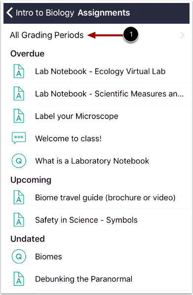 To filter assignments, tap the Filter icon [3] and then select the Not Yet Submitted, To Be Graded, Graded, and/or Other checkboxes [4].