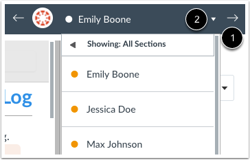 To enable question grading, click the SpeedGrader settings icon [1] and select Options from the drop-down menu [2].