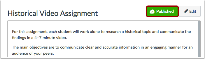 To publish an assignment, click the assignment’s Publish button. The button will change from gray to green.