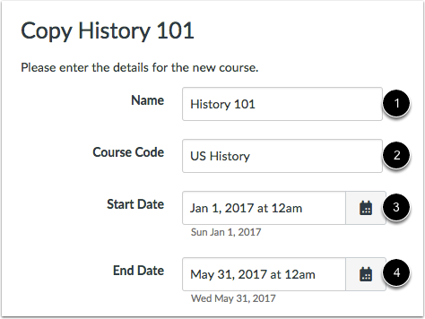Note: If the current course includes course override dates in Course Settings, the Start and End date fields populate with those dates.