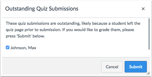 When students leave an untimed quiz without submitting, their submissions will not be considered outstanding. These submissions will be submitted and considered outstanding after an event occurs that attempts to calculate their quiz grade. These events may include ending of availability dates, deleting or editing the quiz, attempting to view the outstanding submission, and editing an assignment group.