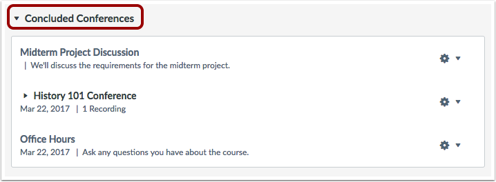 Once the conference has concluded, the conference appears in the Concluded Conferences section on the Conferences page. Updating the status of the conference may take a few minutes.