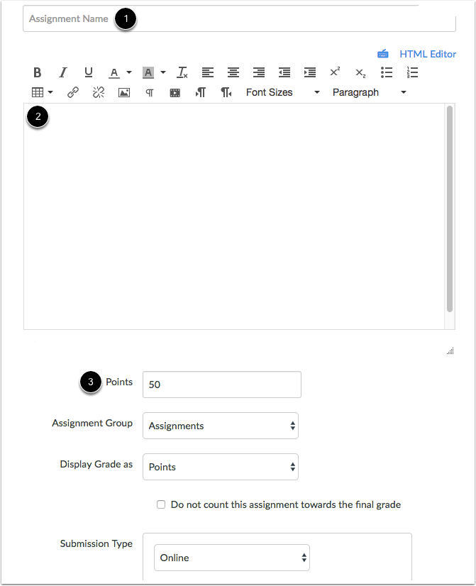 Enter a name [1] and description [2] for your assignment, as well as any other assignment details [3].