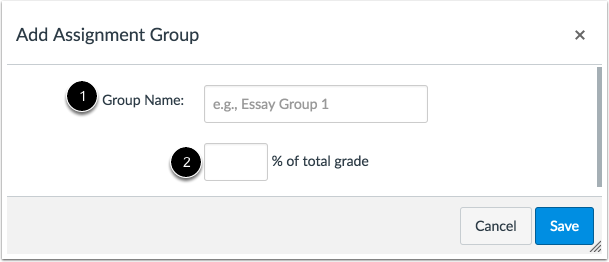 Type the Assignment Group Name in the Group Name field [1]. If you want to weight the final grade for students using assignment groups, the percentage will appear in % of total grade field [2].