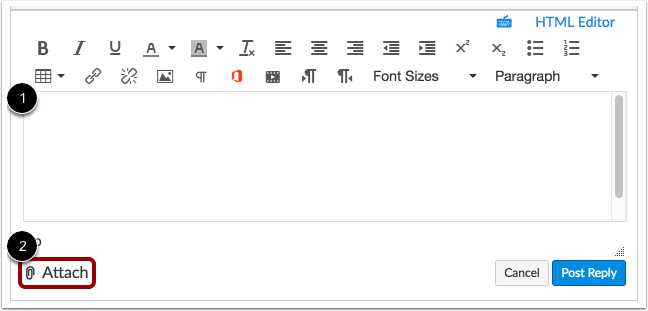 After adding content using the Rich Content Editor to the discussion reply [1], click the Attach link [2].