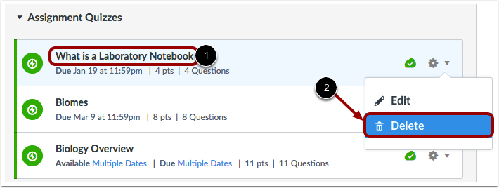 Note: Deleting a quiz will remove it completely from your course. If you would rather hide the quiz or make it inaccessible to submissions, you can lock the quiz or modify the access dates. If the quiz has no student submissions, you can unpublish the quiz.