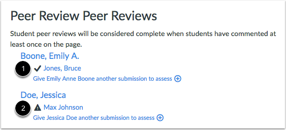 Assigned peer reviews appear underneath the student names. A check mark indicates a peer review has been completed [1]. A warning icon indicates a peer review still needs to be completed [2].