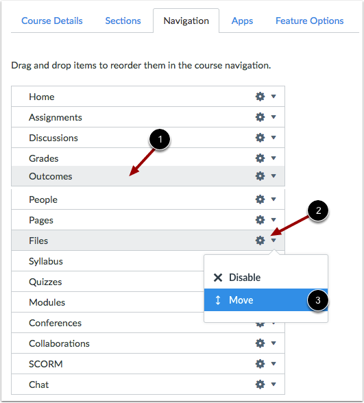 To hide a navigation link from students, click the link Options icon [1] and select the Disable option [2]. The navigation link moves to the Drag items here to hide them from students section [3].
