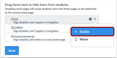- Page disabled; won't appear in navigation: Any LTI links, such as Attendance, Chat, Lucid, and SCORM