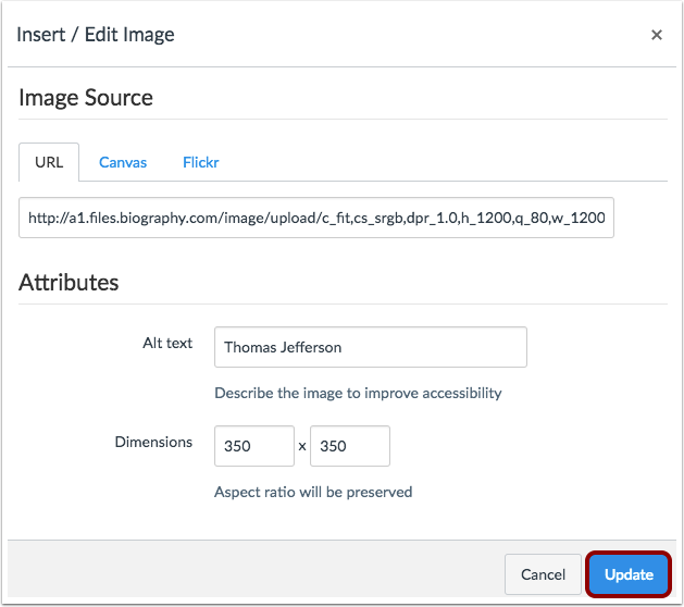 You can insert an image file directly into discussion replies using the image icon. You can embed an image from a website URL or upload and embed an image from your Canvas files. If a change is made to the source of your image after you have embedded it in a discussion reply, the image added to your discussion reply does not be changed.