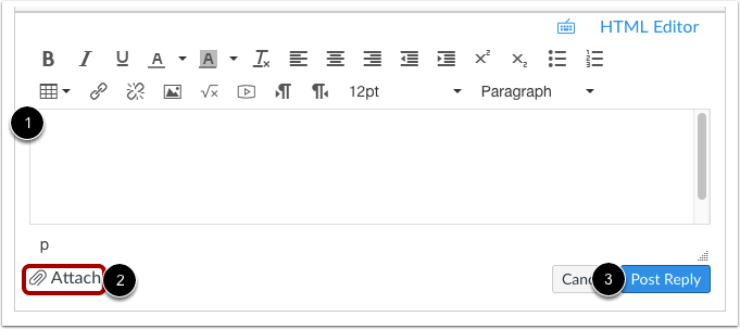 Add your reply, links, files, and other media in the Rich Content Editor [2].