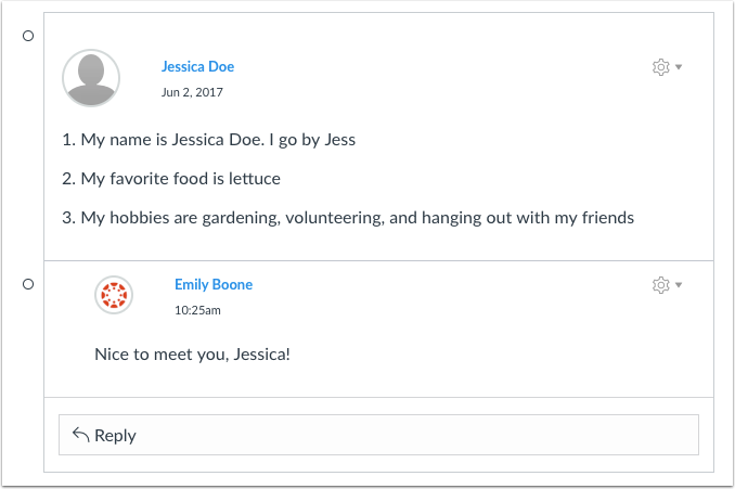 - If the discussion is an anonymous discussion, student names and profile pictures do not display. Posts created by the instructor display the instructor's name and profile picture.