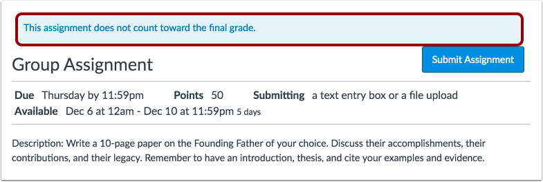 A banner may appear above your assignment to indicate that your instructor has removed the group assignment from total grade calculations. However, this setting does not affect assignment submissions.