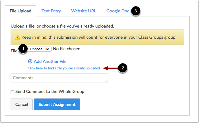 - If you want to submit a file that was previously uploaded, the file must already be in your user files. Any files that have been uploaded to the group's files cannot be accessed through assignment submissions. Learn how to move group files to user files.