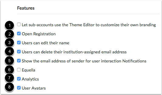 - Sub-account admins can only enable Equella, Turnitin, Analytics, and User Avatars.
