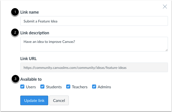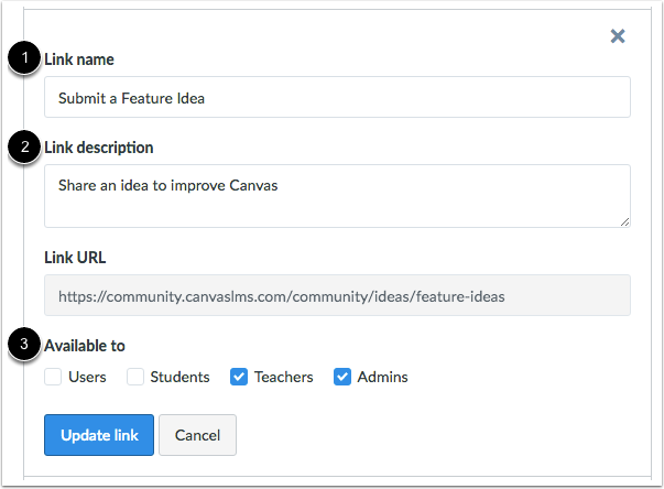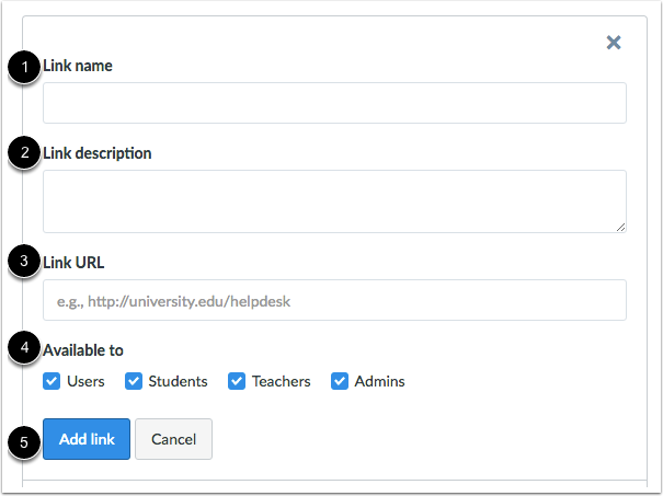 For the Available to checkboxes [4], select the user(s) who can view the link. Options include Everyone, Students, Teachers, Admins, Observers, and Unenrolled. Unless otherwise changed, custom links select checkboxes for all roles.