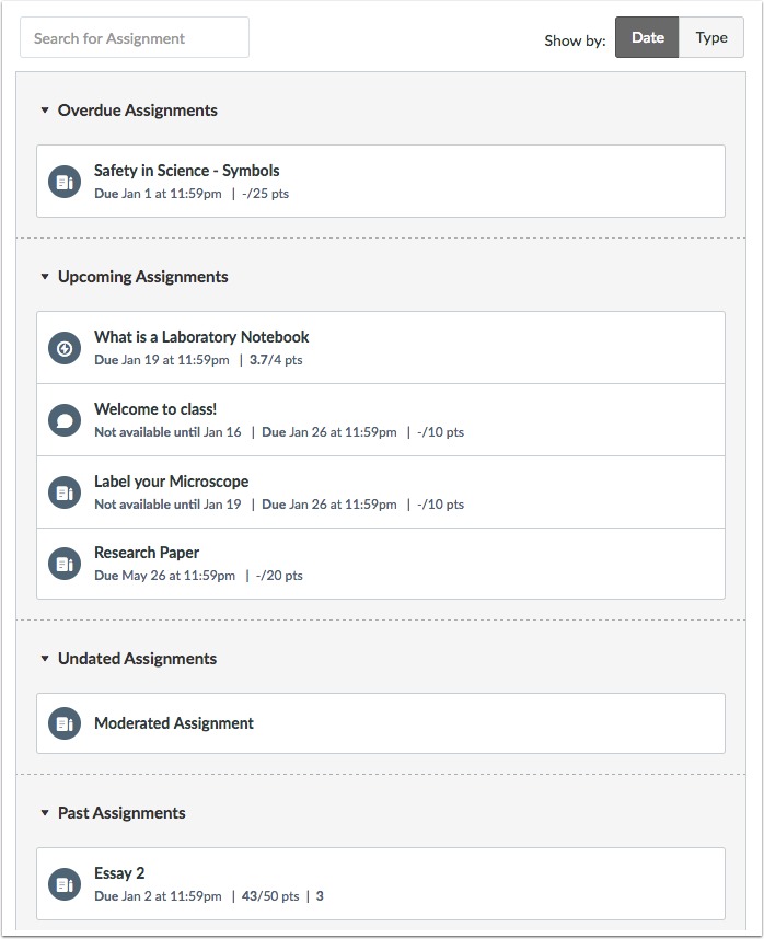 Assignments include Quizzes, graded Discussions, and online submissions (i.e. files, images, text, URLs, etc.). Assignments in Canvas can be used to challenge students' understanding and help assess competency by using a variety of media. The Assignments page shows students all of the Assignments that will be expected of them and how many points each is worth.