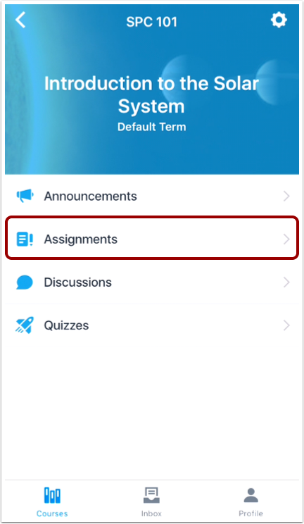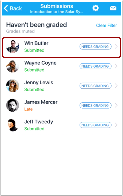 When you open a course, you can see the list of assignments in your course. For each assignment, you can view the status and whether or not submissions need grading. You can also view each student's submission, comments, and files.