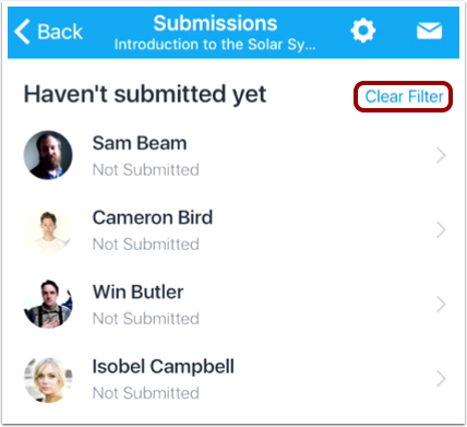 Unless a specific filter was already selected from the assignment page, the Submissions page defaults to the All Submissions page. You can view all students assigned to the assignment and their submission status.