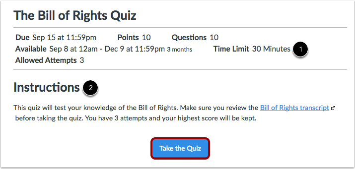 - Instructions [2]: any instructions that your instructor has about the quiz.