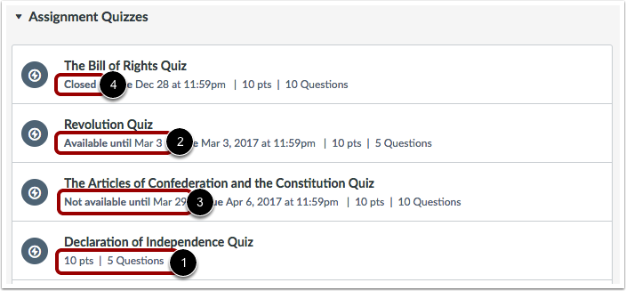 The second set of dates are the Due dates [1] for each respective quiz. Any quizzes submitted after the due date are marked as late; some instructors may deduct points for late submissions. Again, not all quizzes may include a Due date.