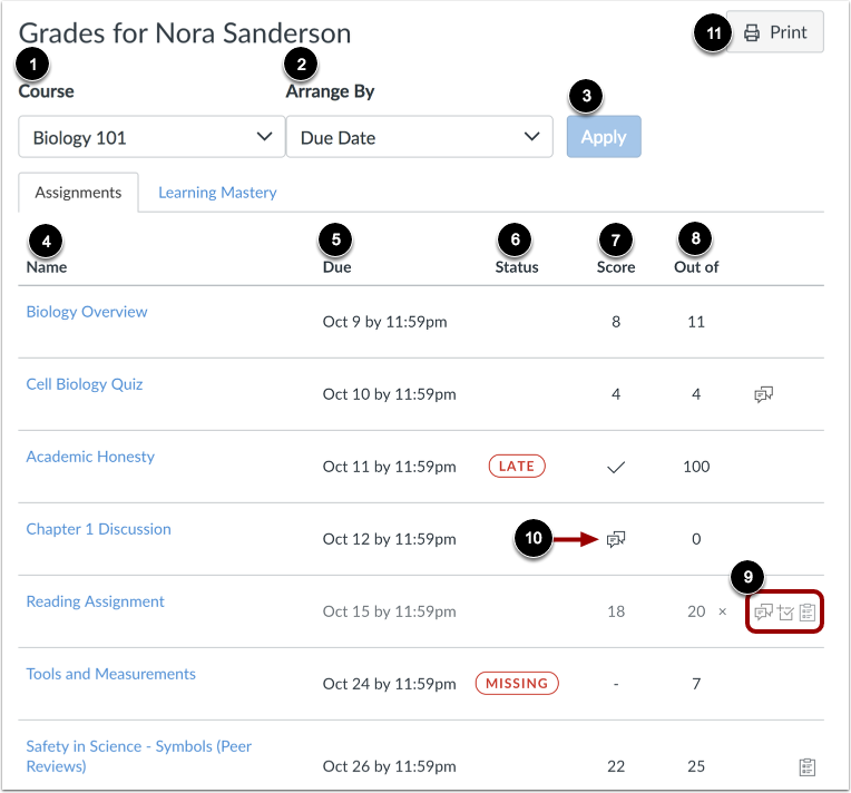 You can view assignment names [4], due dates [5], assignment submission dates [6], statuses [7], scores [8], and total point values [9]. You may also be able to view whether the assignment includes a comments, scoring details, or a scoring rubric [10].
