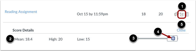 If you can view scoring details, click the Check Mark icon [1]. You can view the grade distribution for the assignment and view the mean, high, and low scores [2].