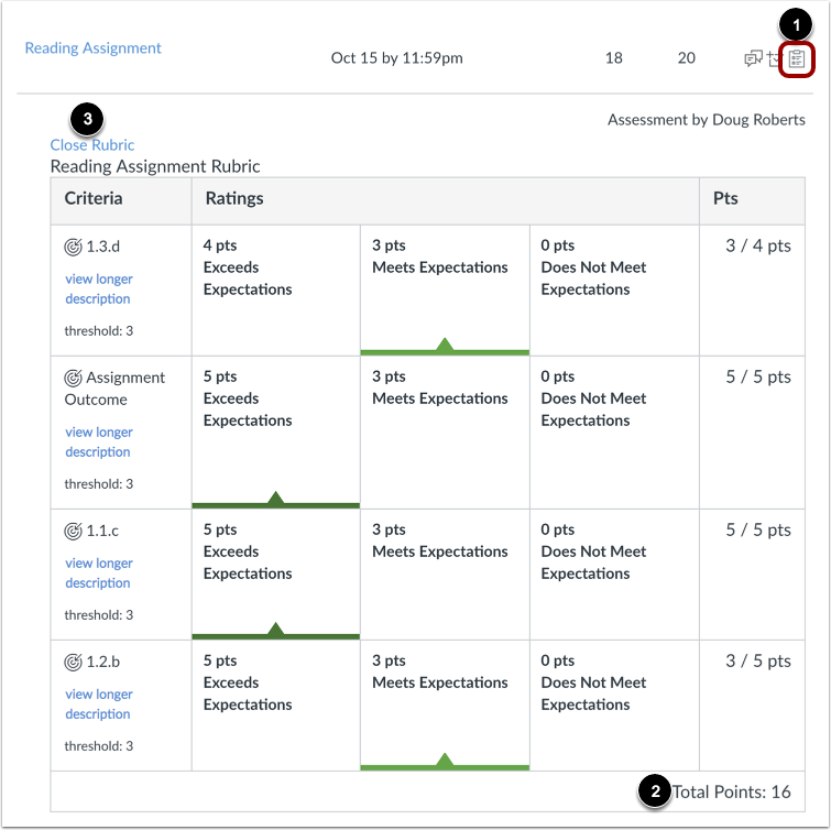 If an assignment includes a rubric, the assignment may display a rubric icon [1]. To view your student's results, click the icon. View your student's score based on the rubric [2]. To close the rubric, click the Close Rubric link [3].