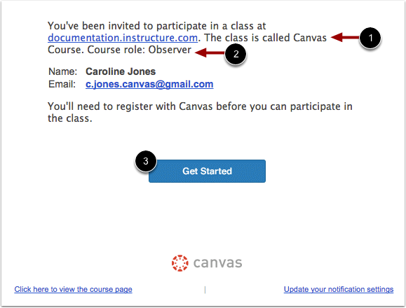 You will receive the course invitation via email. The invitation will include the course name [1] and your user role in the course [2]. To complete registration, click the Get Started button [3].