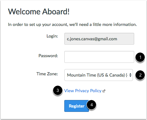If you need to set up an account, you will need to create a password [1], enter your time zone [2], and view the privacy policy [3]. Then click the Register button [4].