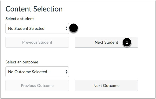 In the Assignment drop-down menu [1], select the outcome you want to view. If you want to view the first outcome in your course, click the Next Outcome button [2].