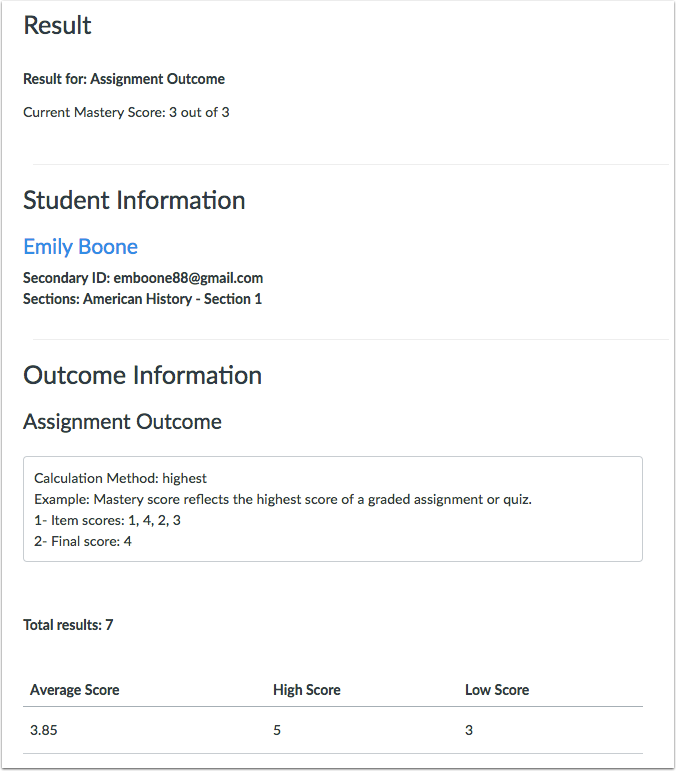Once you select a student and an outcome, the Result, Student Information, and Outcome Information will display all corresponding content. Scroll down the page to view each of these sections. You can revisit the Gradebook settings at any time to hide and show settings.