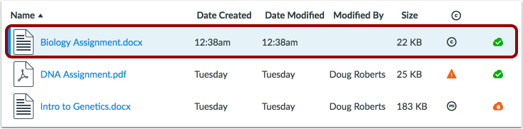 By default, the file is unpublished. To set the availability of an individual file or folder, locate the file or folder’s line item and then click the Status icon [1].