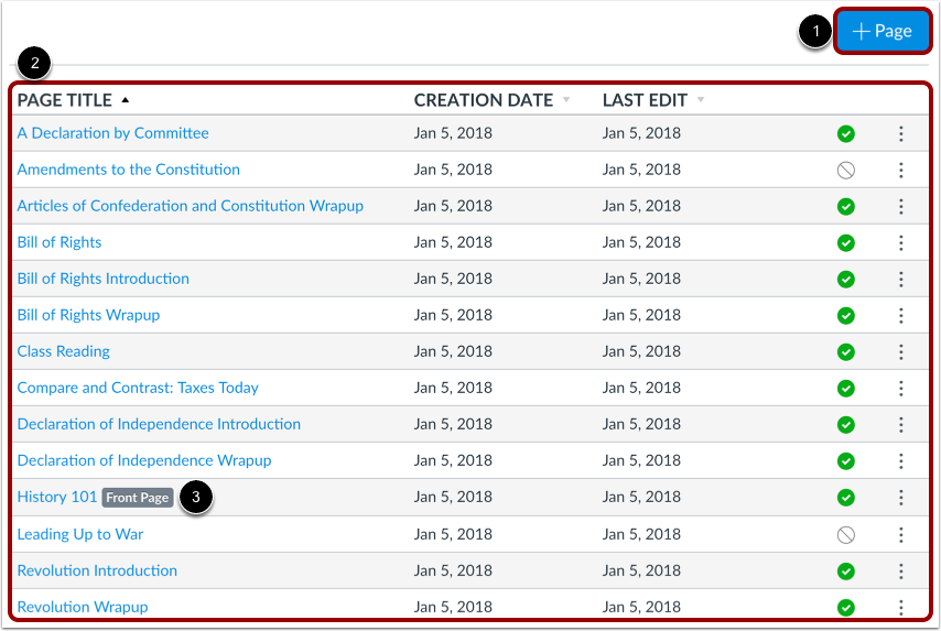 You can view all your pages in your course on the Pages Index Page. As an instructor, you can add new pages, edit pages, and manage page settings.