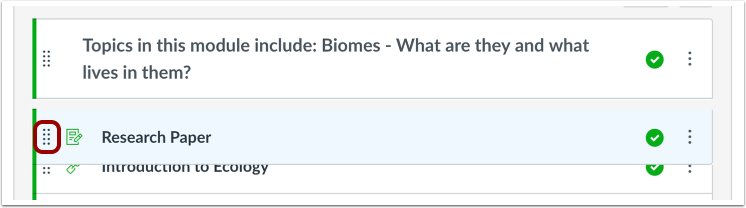You can use the drag and drop option to reorder module items. Click the drag handle next to the module item name. Drop the module item in the desired location by releasing the mouse.
