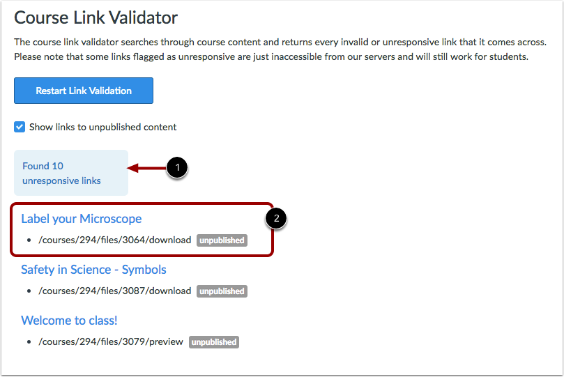 If any links are found in the course, Canvas displays the number of links [1], followed by the name of the content item and the content's associated invalid link(s) [2].