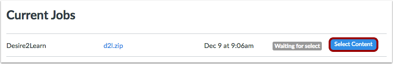 If you chose to select specific content as part of the import process, the current job shows as Waiting for selection [1], which means you must select the content you want to import before it can be completed. You cannot cancel this action. Click the Select content button [2].