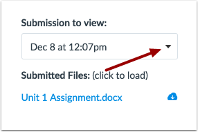 Open the student's Assignment in SpeedGrader. When a student has submitted multiple submissions, you can view them by clicking the Submission to view drop-down menu.