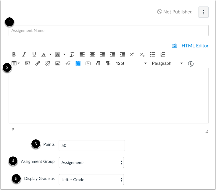 Enter the number of points for the assignment [1], select the Assignment Group [2], and select the grading type from the Display Grade as menu [3].