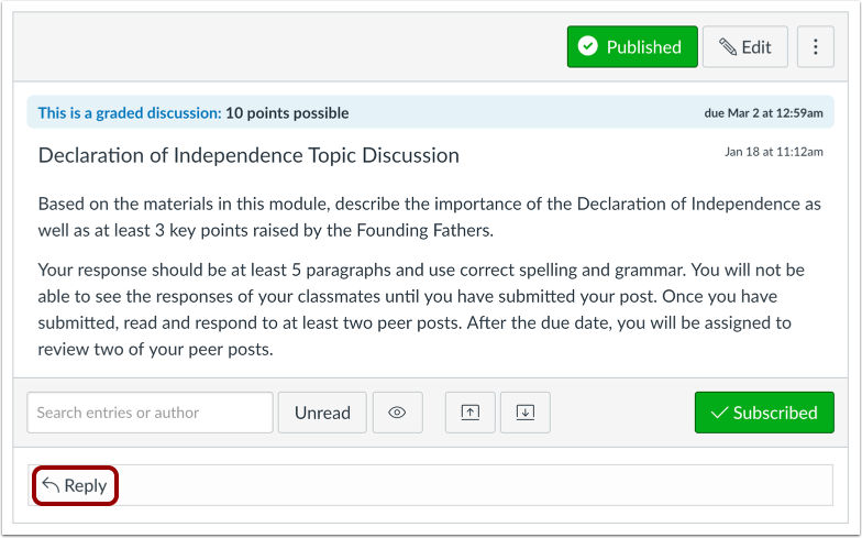 You can insert an image file directly into discussion replies using the image icon. You can embed an image from a website URL or upload and embed an image from your Canvas files. If a change is made to the source of your image after you have embedded it in a discussion reply, the image added to your discussion reply does not be changed.