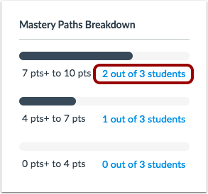 Once students complete a Mastery Paths source item, you can view the breakdown of the mastery path ranges in the item. Each range includes a link that shows the number of students who scored in each range. You can view a specific student’s score for the Mastery Path source item, view the student's submission, view the student's conditional content assignments, and send a message to the student.