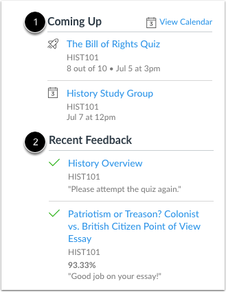 - the Recent Feedback section [2], which shows assignments with instructor feedback during the last four weeks (this section shows to all user roles but feedback is only displayed to students)