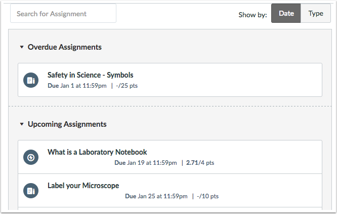 The Assignment List shows the list of assignments for the course with upcoming and recent assignments at the top of the page. Users can click the link of the assignment to view more details.