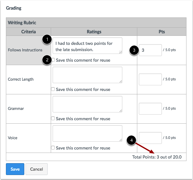In the points column, enter a score for the criterion [3]. Each score will create the total points for the assignment [4].