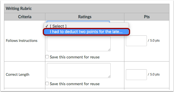 If you select your comment for reuse, in your next student assessment, the comment displays as an option in a comments drop-down menu.