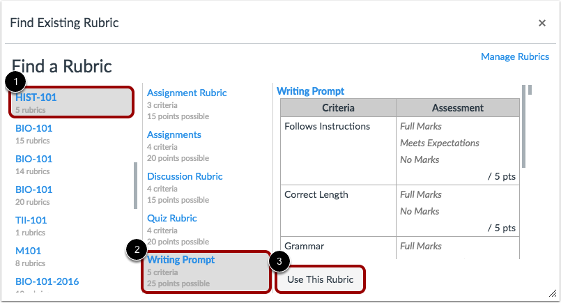 In the first column, select a course or account [1]. In the second column, locate and click the name of a rubric [2]. You can view the criteria and points in each rubric. To select a rubric for the assignment, scroll to the bottom of the rubric and click the Use This Rubric button [3].
