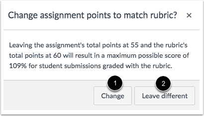 To update the number of points in the assignment, click the Change button [1]. Otherwise, click the Leave different button[2].