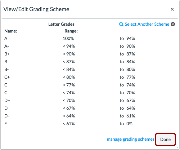 Note: Assignments use the course default grading scheme unless you select another one. Learn how to enable a course default grading scheme.