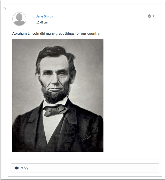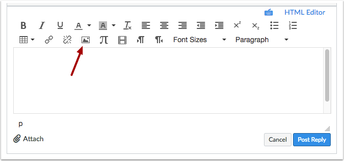 You can embed an image file directly into discussion replies using toolbar and menubar options in the Rich Content Editor. You can upload images from your computer, from a website URL, or from your Canvas user files.