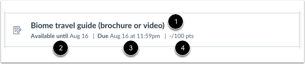 Each assignment displays the assignment name [1], any availability dates for the assignment [2], due date (if any) [3], and the number of points the assignment is worth [4].